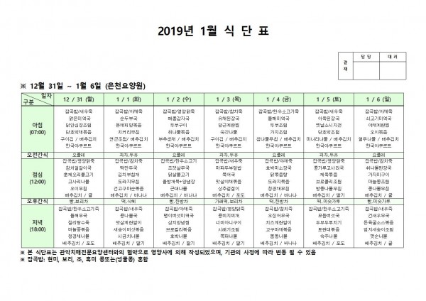 12월 넷째주 식단표 페이지 정보 작성자 은천노인복지회 작성일19-01-22 13:30 조회211,707회 댓글1건 관련링크 이전글 다음글 목록 답변 본문 12월 넷째주 식단표 이전글 다음글 목록 답변