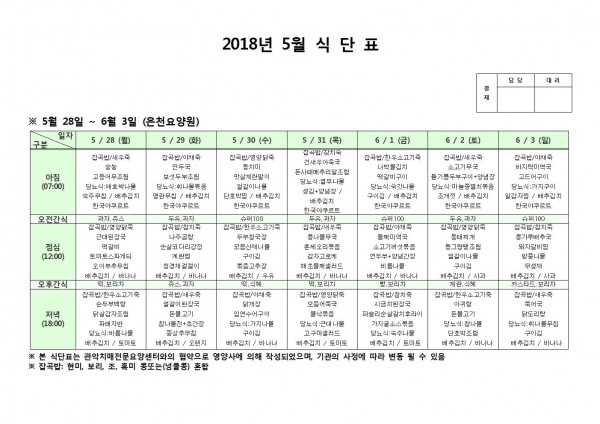 5월 다섯째주 식단표 페이지 정보 작성자 은천노인복지회 작성일18-06-07 10:39 조회207,957회 댓글0건 관련링크 이전글 다음글 목록 답변 본문 5월 다섯쨰주 식단표 이전글 다음글 목록 답변