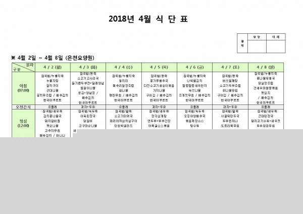 4월 첫째주 식단표 페이지 정보 작성자 은천노인복지회 작성일18-04-02 15:32 조회201,071회 댓글0건 관련링크 이전글 다음글 목록 답변 본문 4월 첫째주 식단표 이전글 다음글 목록 답변