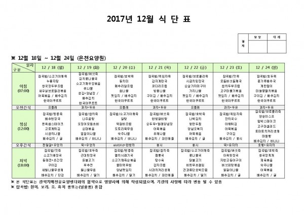 12월 넷째주 식단표 페이지 정보 작성자 은천노인복지회 작성일17-12-18 16:58 조회192,660회 댓글0건 관련링크 이전글 다음글 목록 답변 본문 12월 넷째주 식단표 이전글 다음글 목록 답변