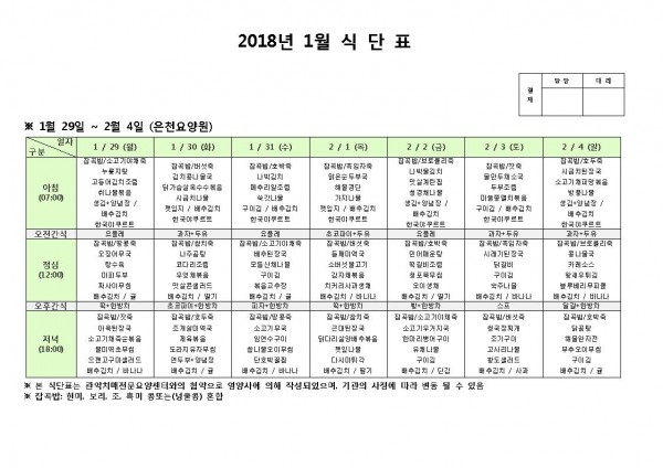1월 다섯째주 식단표 페이지 정보 작성자 은천노인복지회 작성일18-01-31 13:35 조회195,991회 댓글0건 관련링크 이전글 다음글 목록 답변 본문 1월 다섯째주 식단표 이전글 다음글 목록 답변