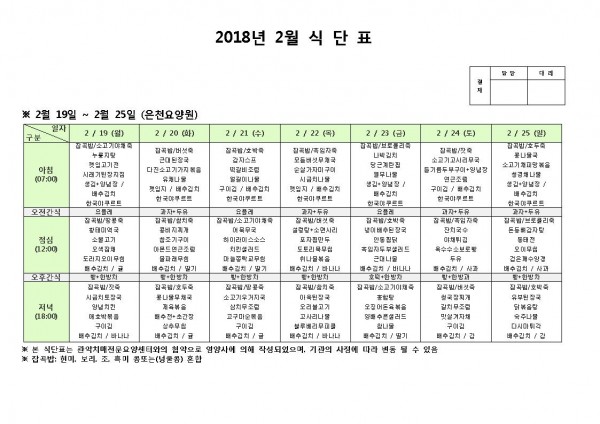2월 셋째주 식단표 페이지 정보 작성자 은천노인복지회 작성일18-02-19 10:50 조회197,271회 댓글0건 관련링크 이전글 다음글 목록 답변 본문 2월 셋째주 식단표 이전글 다음글 목록 답변