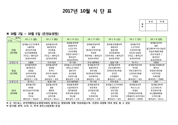 10월 첫째주 식단표 페이지 정보 작성자 은천노인복지회 작성일17-10-11 10:52 조회184,948회 댓글0건 관련링크 이전글 다음글 목록 답변 본문 10월 첫째주 식단표 이전글 다음글 목록 답변