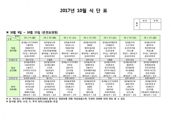 10월 둘째주 식단표 페이지 정보 작성자 은천노인복지회 작성일17-10-17 17:39 조회186,292회 댓글0건 관련링크 이전글 다음글 목록 답변 본문 10월 둘째주 식단표 이전글 다음글 목록 답변