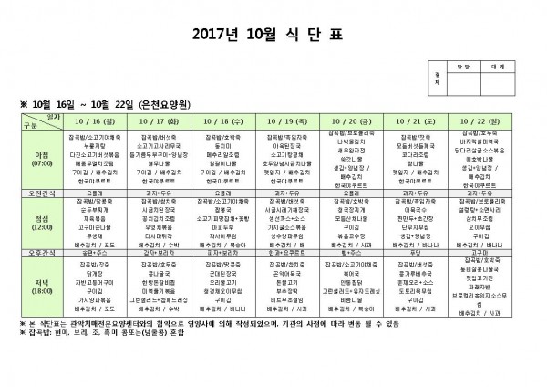 10월 셋째주 식단표 페이지 정보 작성자 은천노인복지회 작성일17-10-17 17:39 조회186,023회 댓글0건 관련링크 이전글 다음글 목록 답변 본문 10월 셋째주 식단표 이전글 다음글 목록 답변