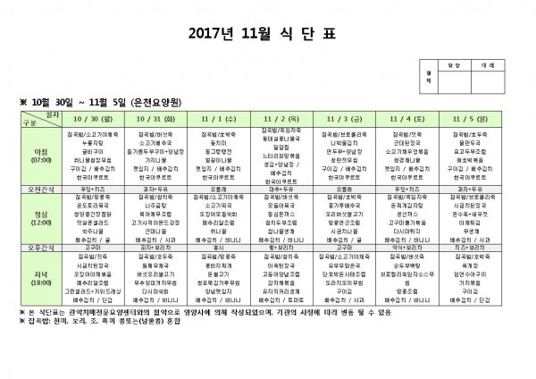 11월 첫째주 식단표 페이지 정보 작성자 은천노인복지회 작성일17-11-09 10:43 조회187,384회 댓글0건 관련링크 이전글 다음글 목록 답변 본문 11월 첫째주 식단표 이전글 다음글 목록 답변