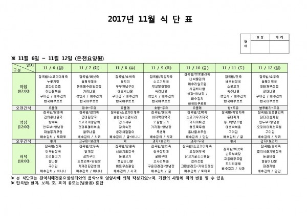11월 둘째주 식단표 페이지 정보 작성자 은천노인복지회 작성일17-11-09 10:44 조회187,206회 댓글0건 관련링크 이전글 다음글 목록 답변 본문 11월 둘째주 식단표 이전글 다음글 목록 답변