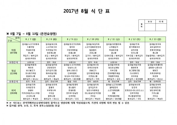 8월 둘째주 식단표 페이지 정보 작성자 은천노인복지회 작성일17-08-07 09:46 조회182,930회 댓글0건 관련링크 이전글 다음글 목록 답변 본문 8월 둘째주 식단표 이전글 다음글 목록 답변
