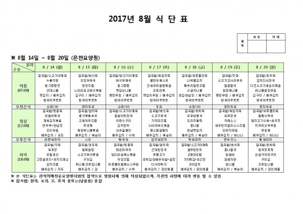 8월 셋째주 식단표 페이지 정보 작성자 은천노인복지회 작성일17-08-14 14:05 조회182,266회 댓글0건 관련링크 이전글 다음글 목록 답변 본문 8월 셋째주 식단표 이전글 다음글 목록 답변