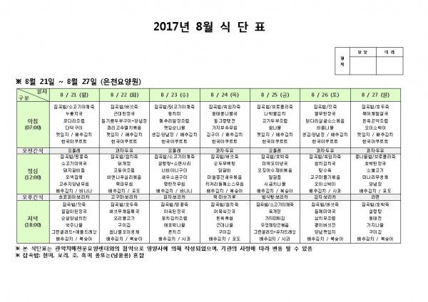 8월 넷째주 식단표 페이지 정보 작성자 은천노인복지회 작성일17-08-21 10:51 조회182,399회 댓글0건 관련링크 이전글 다음글 목록 답변 본문 8월 넷째주 식단표 이전글 다음글 목록 답변