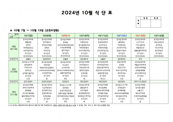 10월 둘째주 식단표 페이지 정보 작성자 은천노인복지회 작성일24-10-04 11:48 조회22,629회 댓글0건 관련링크 이전글 다음글 목록 답변 본문 . 이전글 다음글 목록 답변