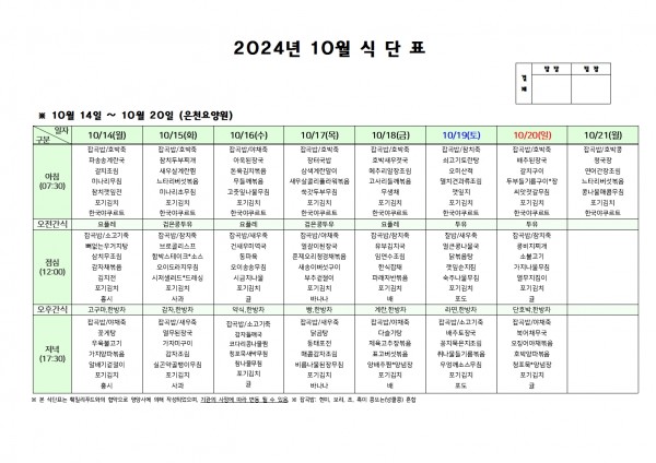 10월 셋째주 식단표 페이지 정보 작성자 은천노인복지회 작성일24-10-11 16:45 조회22,413회 댓글0건 관련링크 이전글 다음글 목록 답변 본문 . 이전글 다음글 목록 답변