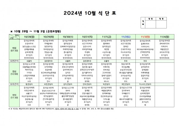 10월 다섯째 주 식단표 페이지 정보 작성자 은천노인복지회 작성일24-10-24 15:18 조회21,867회 댓글0건 관련링크 이전글 다음글 목록 답변 본문 . 이전글 다음글 목록 답변