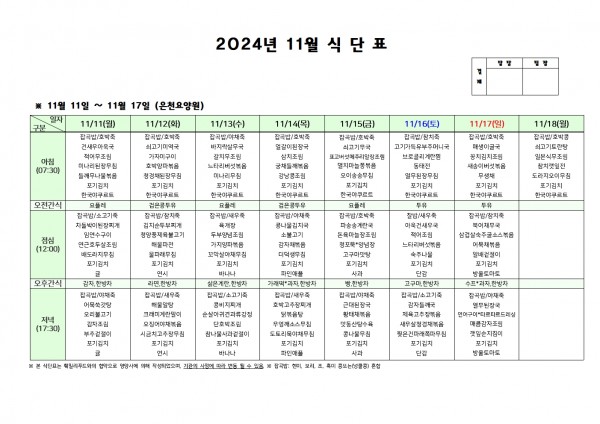 11월 둘째주 식단표 페이지 정보 작성자 은천노인복지회 작성일24-11-07 16:50 조회21,807회 댓글0건 관련링크 이전글 다음글 목록 답변 본문 . 이전글 다음글 목록 답변