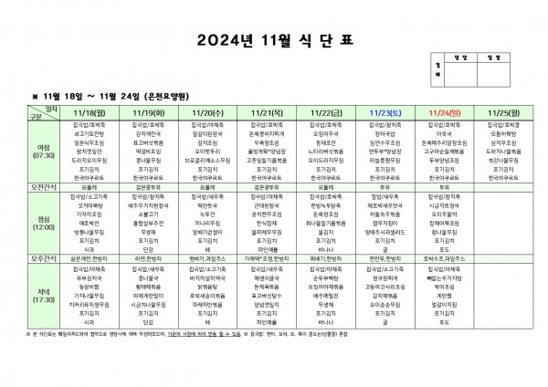 11월 셋째주 식단표 페이지 정보 작성자 은천노인복지회 작성일24-11-15 09:26 조회21,617회 댓글0건 관련링크 이전글 다음글 목록 답변 본문 . 이전글 다음글 목록 답변