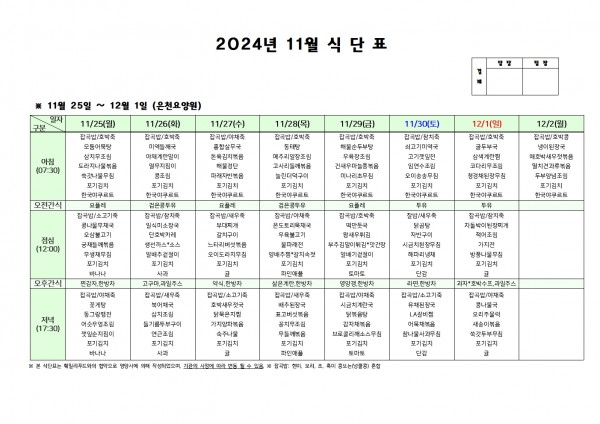 11월 넷째주 식단표 페이지 정보 작성자 은천노인복지회 작성일24-11-22 09:32 조회21,417회 댓글0건 관련링크 이전글 다음글 목록 답변 본문 . 이전글 다음글 목록 답변