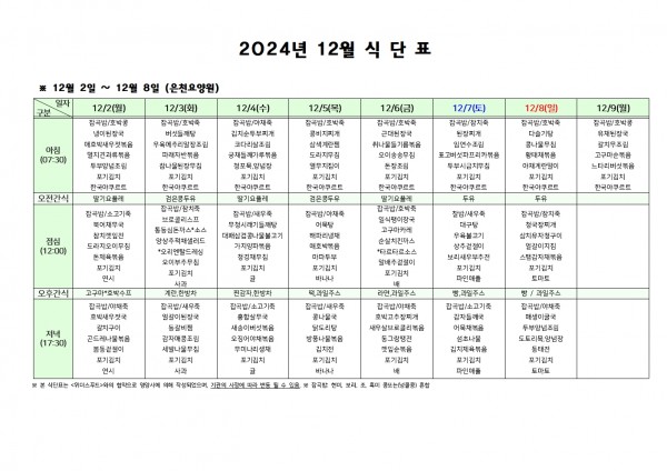12월 첫째주 식단표 페이지 정보 작성자 은천노인복지회 작성일24-11-29 16:53 조회21,037회 댓글0건 관련링크 이전글 다음글 목록 답변 본문 . 이전글 다음글 목록 답변