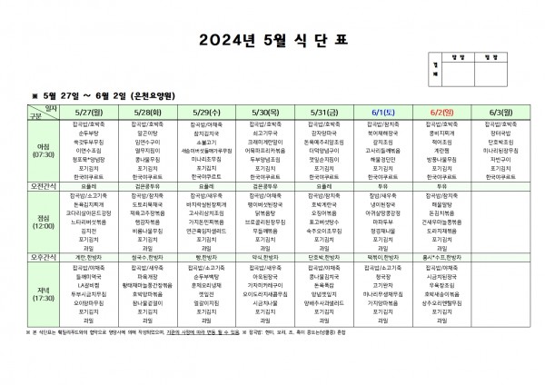 5월 다섯째주 식단표 페이지 정보 작성자 은천노인복지회 작성일24-05-24 16:18 조회27,978회 댓글0건 관련링크 이전글 다음글 목록 답변 본문 . 이전글 다음글 목록 답변