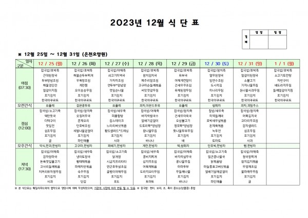 12월 다섯째주 식단표 페이지 정보 작성자 은천노인복지회 작성일23-12-22 15:50 조회35,960회 댓글0건 관련링크 이전글 다음글 목록 답변 본문 . 이전글 다음글 목록 답변