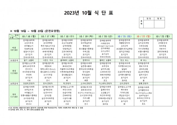 10월 셋째주 식단표 페이지 정보 작성자 은천노인복지회 작성일23-10-12 17:24 조회39,638회 댓글0건 관련링크 이전글 다음글 목록 답변 본문 . 이전글 다음글 목록 답변