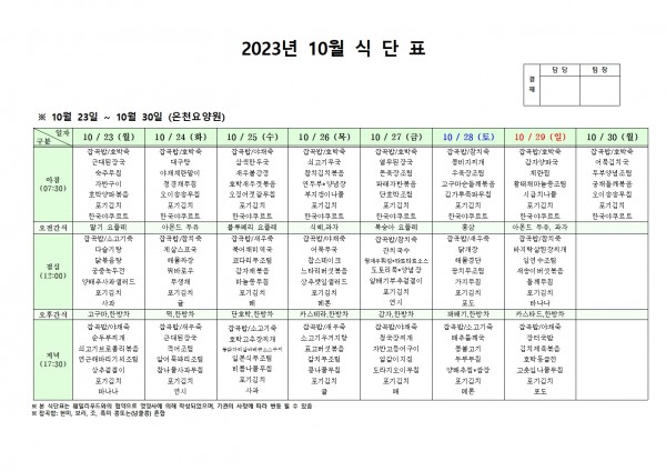 10월 넷째주 식단표 페이지 정보 작성자 은천노인복지회 작성일23-10-19 16:41 조회39,582회 댓글0건 관련링크 이전글 다음글 목록 답변 본문 . 이전글 다음글 목록 답변
