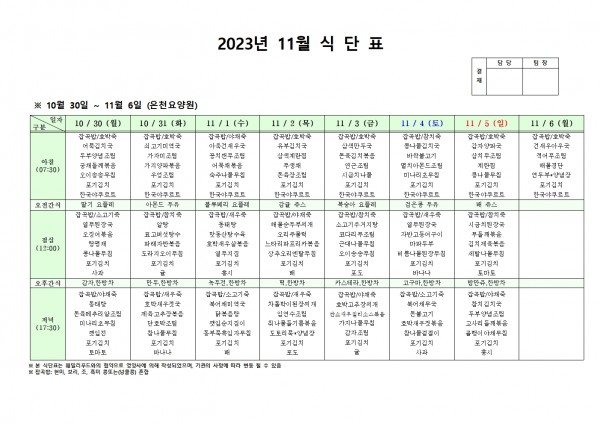 11월 첫째주 식단표 페이지 정보 작성자 은천노인복지회 작성일23-10-26 13:39 조회38,889회 댓글0건 관련링크 이전글 다음글 목록 답변 본문 . 이전글 다음글 목록 답변