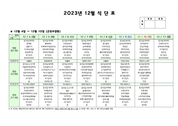12월 둘째주 식단표 페이지 정보 작성자 은천노인복지회 작성일23-12-01 16:35 조회35,011회 댓글0건 관련링크 이전글 다음글 목록 답변 본문 . 이전글 다음글 목록 답변
