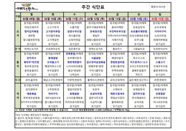 2월 둘째주 식단표 페이지 정보 작성자 은천노인복지회 작성일26-02-06 11:17 조회4,210회 댓글0건 관련링크 이전글 다음글 목록 답변 본문 2월 둘째주 어르신 식단표 안내해 드립니다. 정성과 영양을 담아 준비하겠습니다. 이전글 다음글 목록 답변