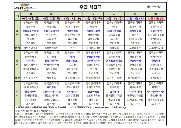 3월 둘째주 식단표 페이지 정보 작성자 은천노인복지회 작성일26-03-06 15:04 조회2,200회 댓글0건 관련링크 이전글 다음글 목록 답변 본문 3월 둘째주 어르신 식단표 안내해 드립니다. 정성과 영양을 담아 준비하겠습니다. 이전글 다음글 목록 답변