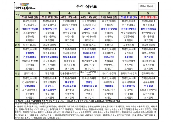3월 셋째주 식단표 페이지 정보 작성자 은천노인복지회 작성일26-03-13 15:20 조회2,033회 댓글0건 관련링크 이전글 다음글 목록 답변 본문 3월 셋째주 어르신 식단표 안내해 드립니다. 정성과 영양을 담아 준비하겠습니다. 이전글 다음글 목록 답변