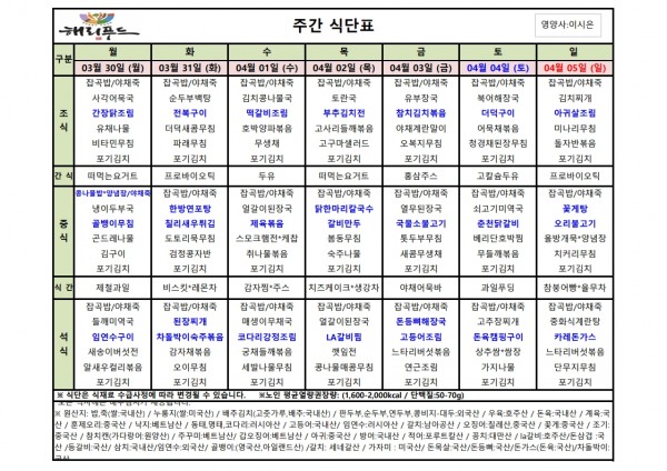 3월 다섯째주 식단표 페이지 정보 작성자 은천노인복지회 작성일26-03-26 17:49 조회596회 댓글0건 관련링크 이전글 다음글 목록 답변 본문 3월 다섯째주 어르신 식단표 안내해 드립니다. 정성과 영양을 담아 준비하겠습니다. 이전글 다음글 목록 답변