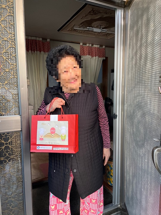 [재가노인지원센터] 설명절 선물지원서비스 페이지 정보 작성자 은천노인복지회 작성일21-02-26 09:42 조회25,345회 댓글0건 관련링크 이전글 다음글 목록 답변 본문 2021년 설 멸정을 맞이하여 어르신들을 찾아뵙고 선물을 전하면서 안부확인을 진행하였습니다. 이전글 다음글 목록 답변
