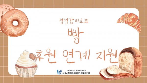 [재가노인지원서비스] 2026년 3월 영성감리교회(빵) 후원 페이지 정보 작성자 은천노인복지회 작성일26-04-06 11:18 조회7회 댓글0건 관련링크 이전글 다음글 목록 답변 본문 기관 인근에 위치한 '영성감리교회'에서 빵(단팥, 소보로, 완두앙금) 200개를 후원해주셨습니다. 이전글 다음글 목록 답변