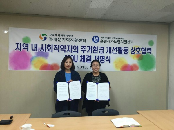 동대문지역자활센터와 협약 페이지 정보 작성자 은천노인복지회 작성일17-01-11 15:47 조회36,474회 댓글0건 관련링크 이전글 다음글 목록 답변 본문 동대문지역 자활센터와 협약을 체결하여어르신들 도배장판 교체에 도움을 주시기로 하였다. 이전글 다음글 목록 답변