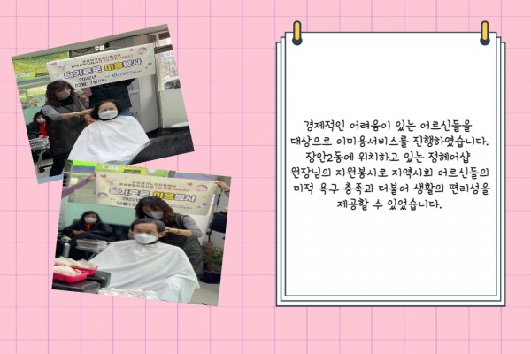 [재가노인지원서비스] 이미용 서비스 페이지 정보 작성자 은천노인복지회 작성일22-03-30 14:02 조회19,137회 댓글0건 관련링크 이전글 다음글 목록 답변 본문 3월 이미용 서비스 이전글 다음글 목록 답변