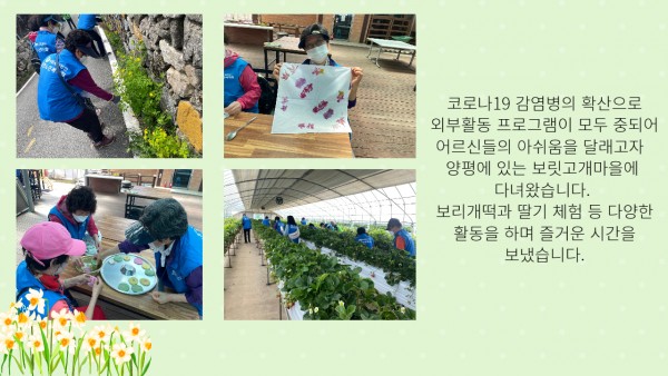 [재가노인지원] 봄 나들이 페이지 정보 작성자 은천노인복지회 작성일22-06-03 17:15 조회18,866회 댓글0건 관련링크 이전글 다음글 목록 답변 본문 재가노인지원센터 어르신들과 양평 보릿고개마을로 나들이를 다녀왔습니다. 이전글 다음글 목록 답변